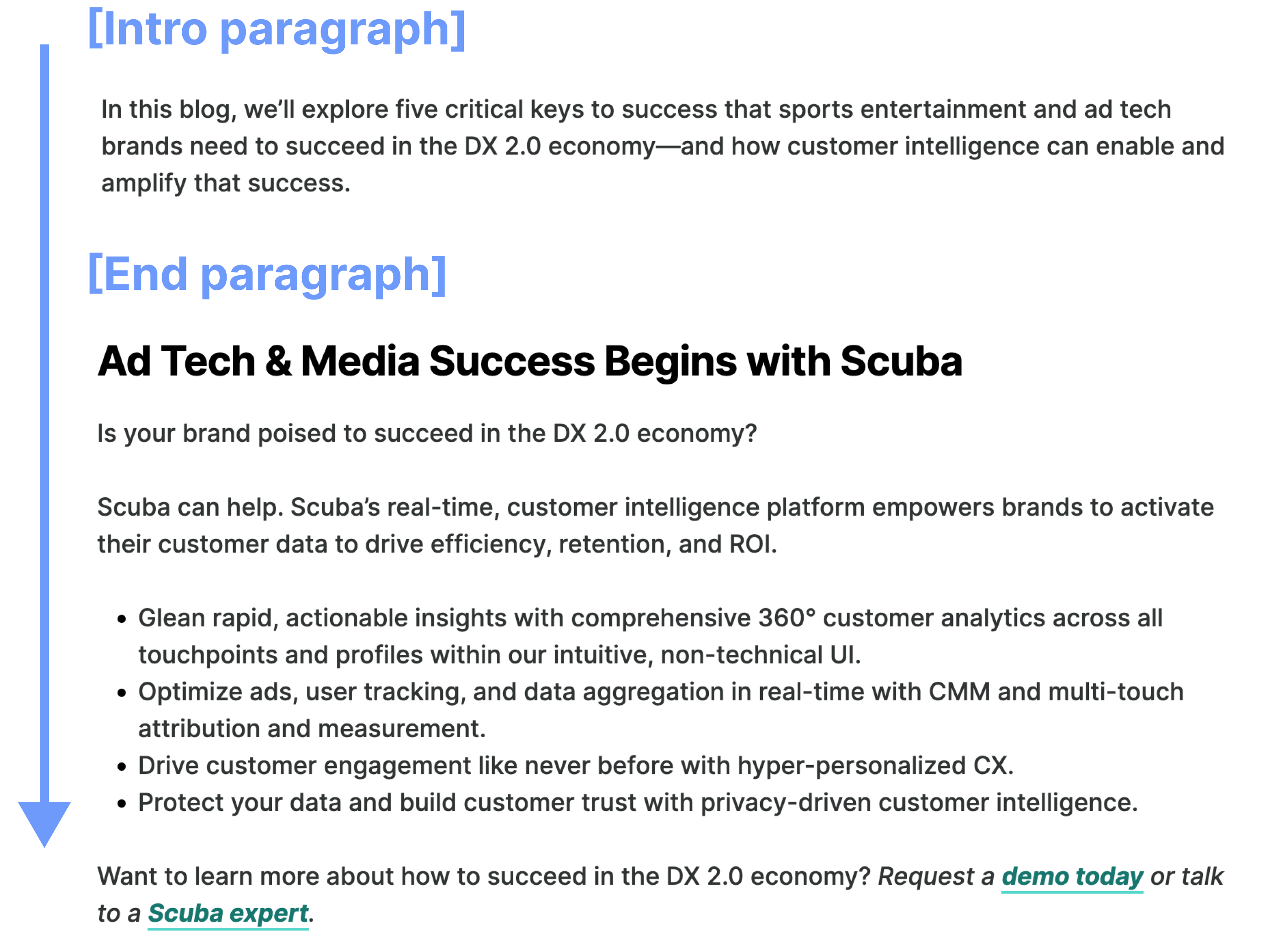 I began by reviewing the blog brief provided by Scuba's digital content manager. The brief outlined the blog's general structure with H1, H2, and sub-header guidelines for SEO-optimization.